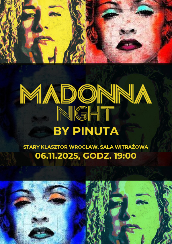 Wrocławską wokalistkę PiNutę, którą publiczność Starego Klasztoru może kojarzyć ze znakomitymi koncertami z przebojami Sade, zobaczymy tym razem w repertuarze ikony muzyki pop - MADONNY. Madonna to kolorowy ptak muzycznej sceny, a jej produkcje wyznaczają trendy na świecie. Madonna to manifestacja kobiecej ekspresji, dlatego też do przebojowego wieczoru PiNuta zaprosiła wspaniałych muzycznych gości. Artystce towarzyszyć będą znakomici wrocławscy muzycy
